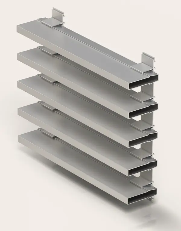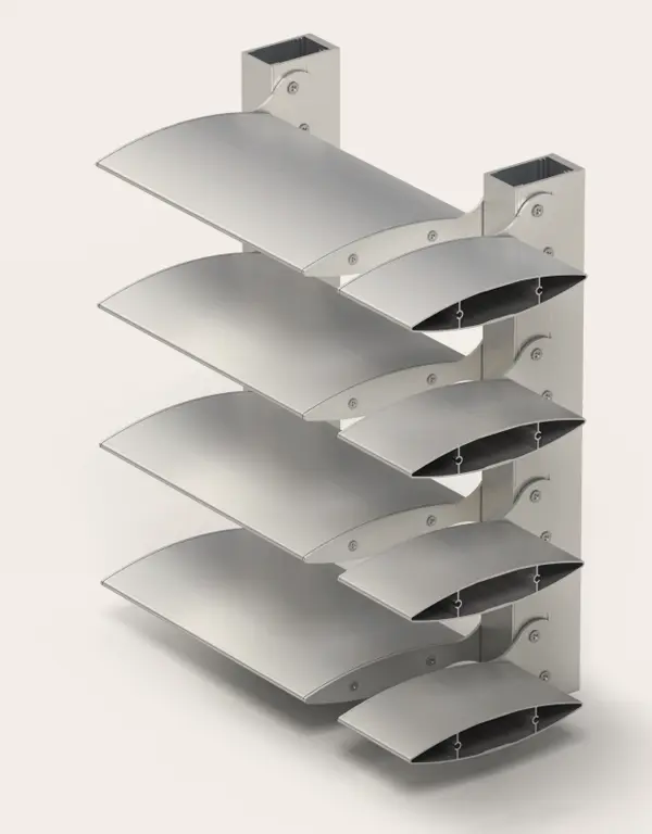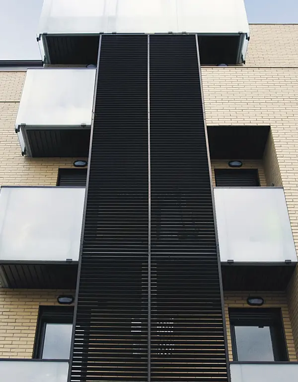 Solución eficaz para controlar la incidencia de los rayos del sol en la temperatura interior de un edificio. La radiación solar es absorbida y reflejada por estas lamas exteriores, favoreciendo la eficiencia energética del inmueble y disminuyendo la necesidad de refrigeración artificial. Al mismo tiempo, funcionan como elemento decorativo aportando una estética vanguardista a la fachada.