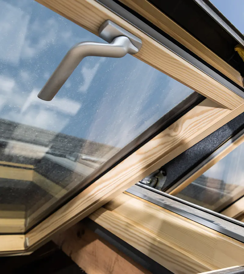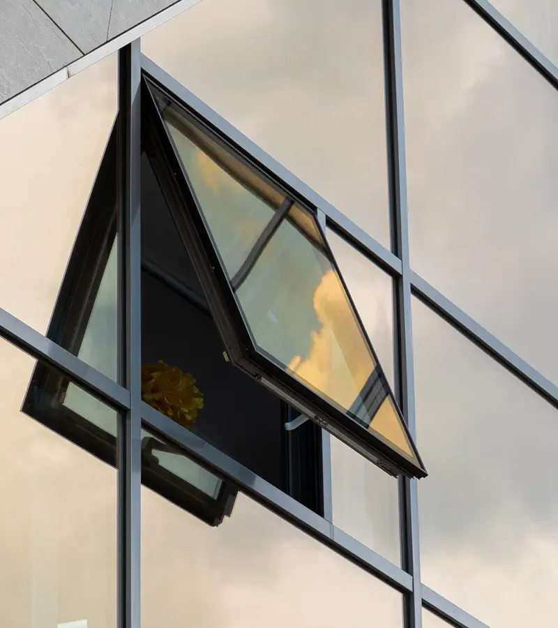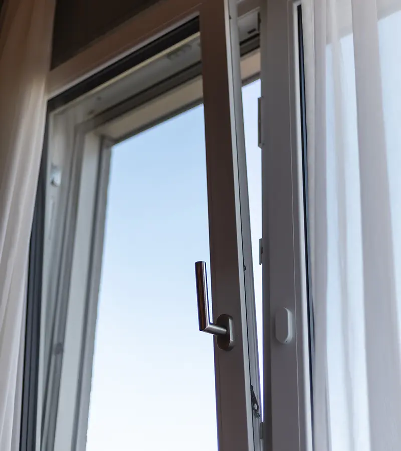 Sistema abisagrado con marco de 54 mm, rotura de puente térmico de 24 mm y una capacidad máxima de acristalamiento de 41 mm. Óptimo rendimiento térmico y acústico -hasta 46 dB de protección frente al ruido.